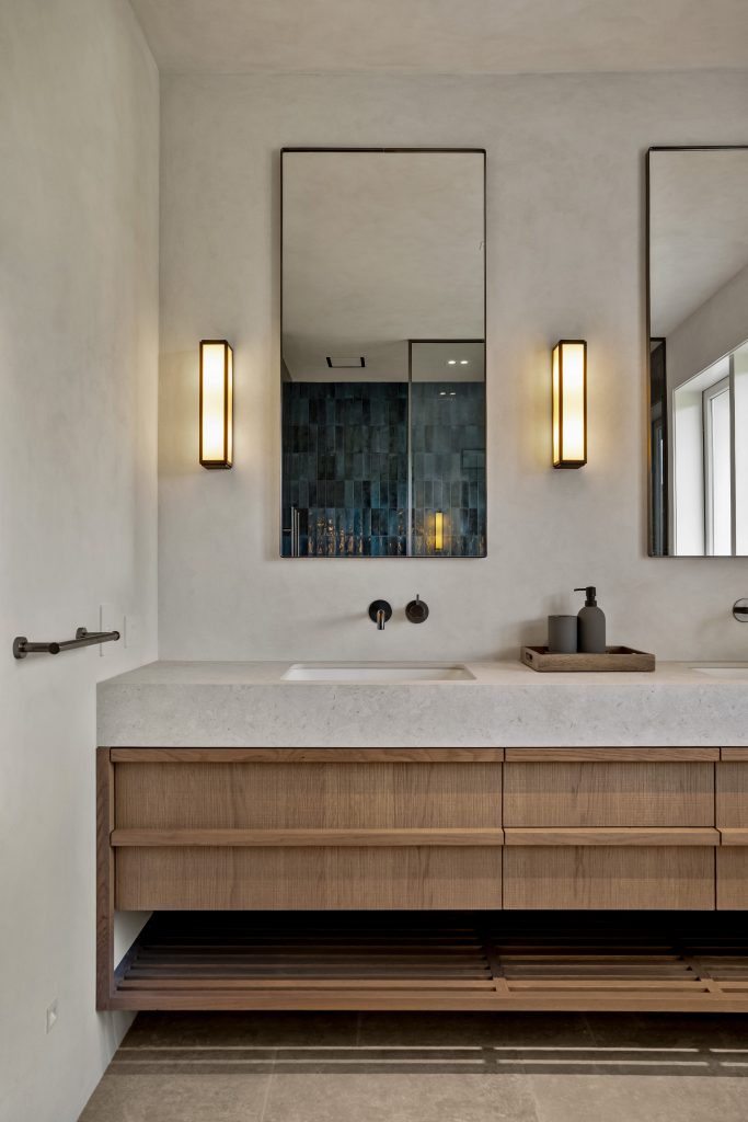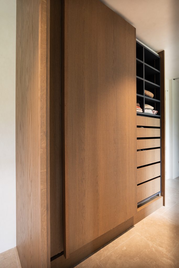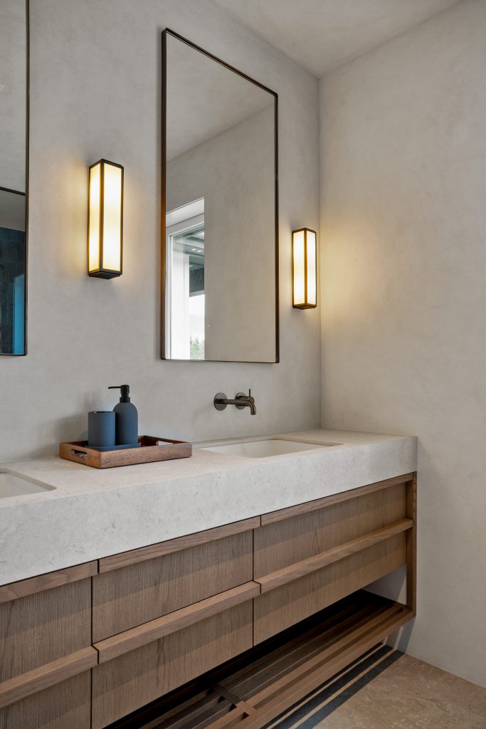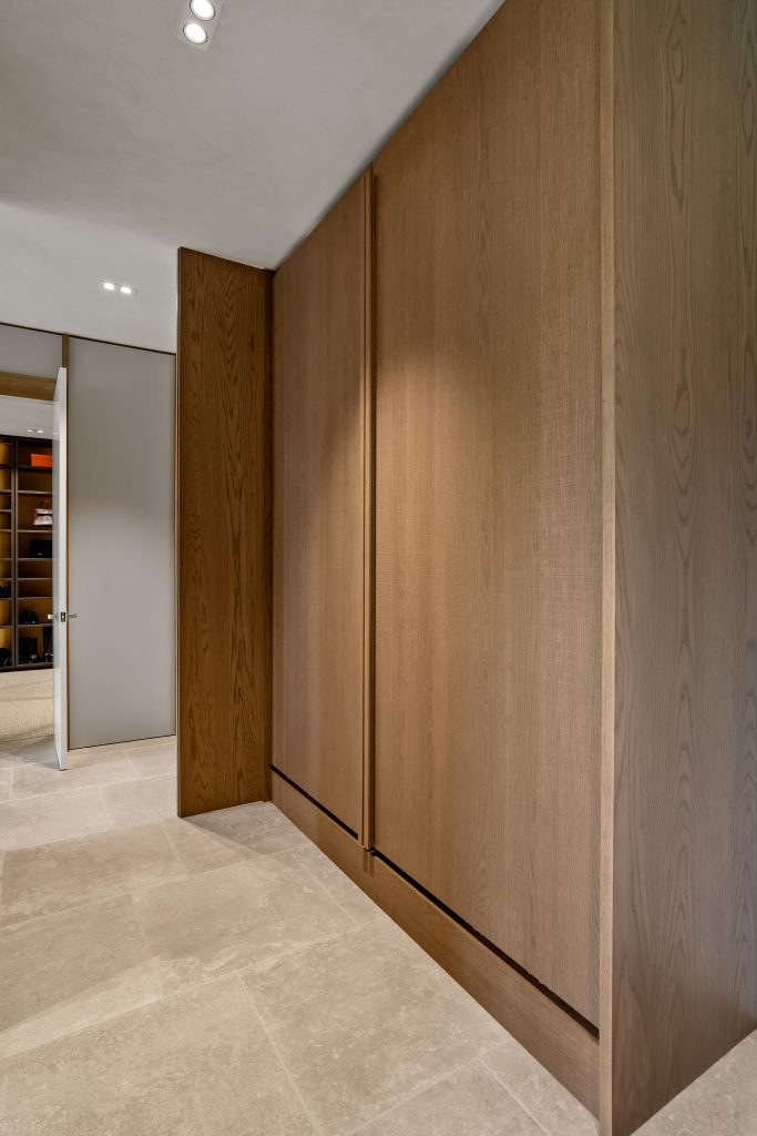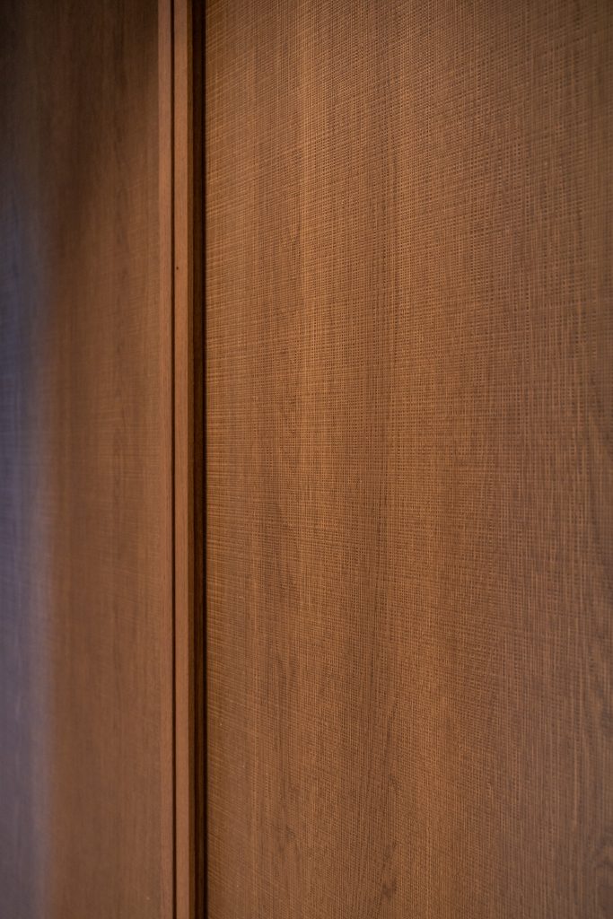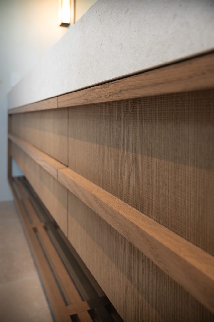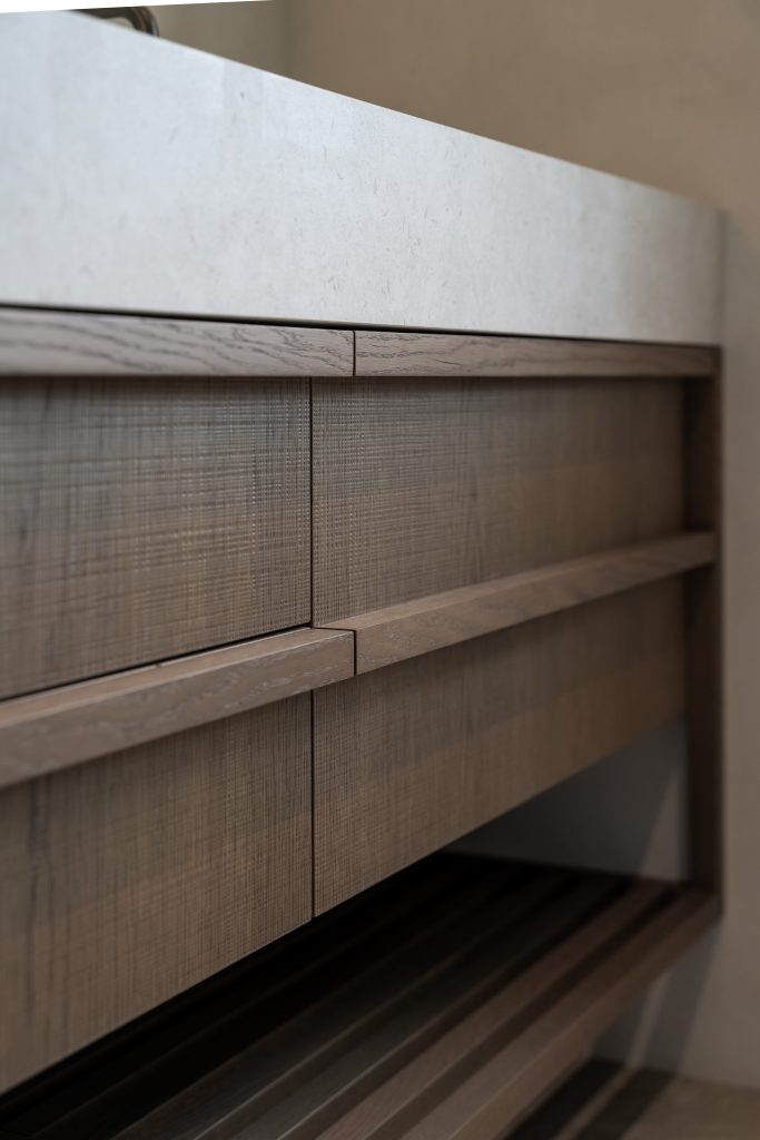 This Lake Hayes Estate home features Latho Move C European Oak veneer throughout, characterised by its finely etched, woven-like texture. The subtle crosshatch pattern creates depth, catching the light to create quiet visual interest. From the floating double vanity to bespoke laundry and wardrobe cabinetry, the timber softens the white marble surfaces and tiled walls for a clean, considered finish.